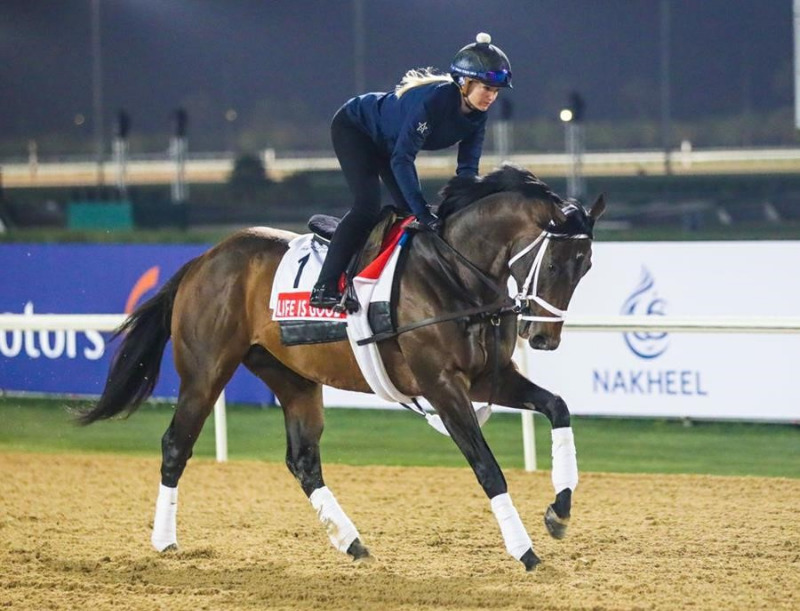 After a 13-hour flight from Miami, Hall of Fame trainer Todd Pletcher and the ownership connections of China Horse Club and WinStar Farm got a chance to see the presumptive World Cup favourite Life Is Good train for the first time at 5am on Tuesday. After backing up to the 1/8 pole the four-year-old cogalloped 1 1/2 miles and, as has been the case all week, he got stronger as the gallop went along. Amelia Green, the only rider who sits on Life Is Good’s back, had to use all her strength to pull him up as he desperately wanted to continue on with his morning trackwork.