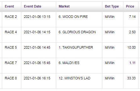 5 years 3 months agodurbs wrote:Magi wrote: Christoph Soumillon looks really good value at 11/2 for the Jockeys Challenge. I had a punt and a small 600/20 on Jerry Chau. Also 550/10 Vincent Ho.