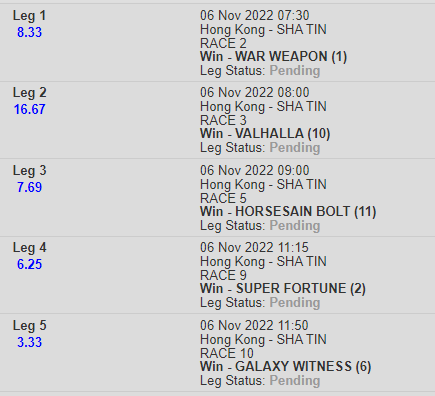 Race 5 11 Horsesain Bolt 11/7/8/5 (Best Bet)