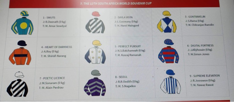 Please see attached the silks that were sent to me for Mauritius Racing Today. They had the wrong cap change on 2 and 7 in Race 7. Number 7 actually had the red cap and not the 2 as indicated by the colors sent to me. I've taken it up with the team and they will let me know why and what happened