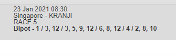 Mr Malek seems to face a weak field, should win easily but with Kranji they always bring to the top the one we don't like. I'm not adding it to my Canadian the odds are too skinny, i prefer evens or better. I also like Decreto thou these Class 5 contests always bring upset results. Hope Try See is back to best fitness. My Jackpot legs are last 4 legs of Bipot.