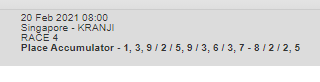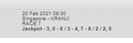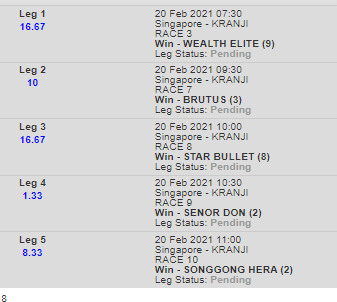 Hold thumbs for me .... last leg Kranji jackpot I have 1,3,5,6,11 for 15% .... minimum payout R8000