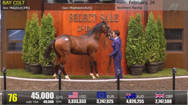 A Maurice colt out of multiple Australian Group One winner Mosheen has lit up the first day of the JRHA Select Sale in Hokkaido, selling for 450 million yen (AU$4.8 million) on Monday.