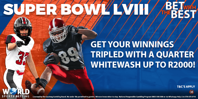 Take a straight bet on either team to win the Super Bowl LVIII and if your bet wins and your selection leads at the end of every quarter, we will triple your winnings in Free Bets up to R2000!
