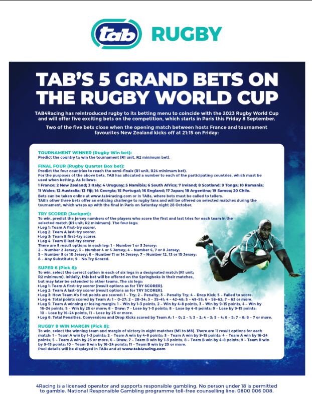 The 2023 Rugby World Cup kicks off on Friday night 8 September, when hosts France clash with New Zealand in Paris, and TAB4Racing will operate an exciting range of five bets on this great tournament.