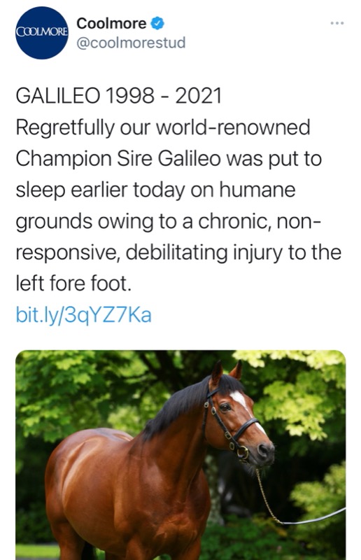 What terrible news. Surely the best sire ever. One can go backwards and say what about Sadler's wells and then northern dancer. Then skip one to nearco whose two grandsons were northern dancer and bold ruler. I suppose as a sire of sires northern dancer is the best but as a sire of race horses Galileo is the very best