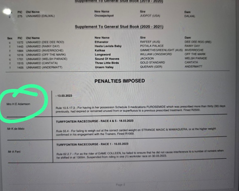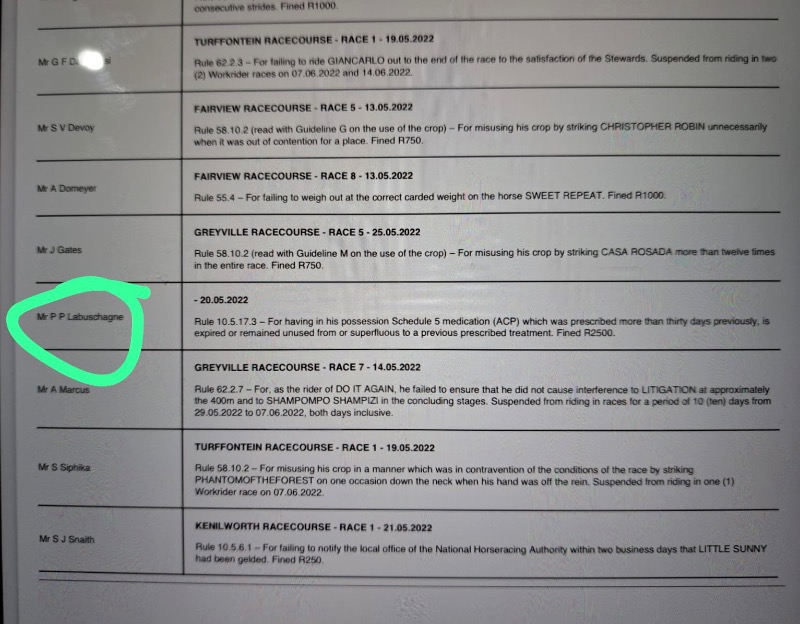 The NHA received written confirmation from the Hong Kong Jockey Club Racing Laboratory on Wednesday, 13 September 2023, that the specimens taken from AXEL COLLINS and YOURE MY SUNSHINE were analysed and the presence of the prohibited substance, Lidocaine was found to be present, unequivocally confirming the initial findings of The National Horseracing Authority of Southern Africa’s Laboratory.
