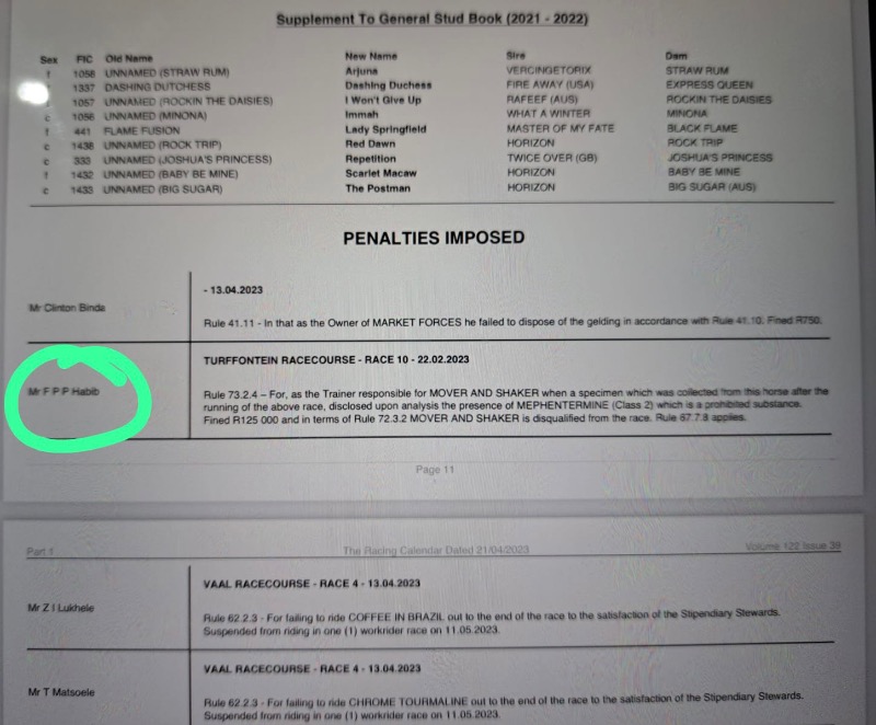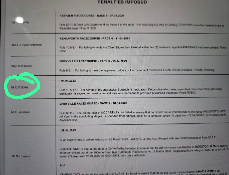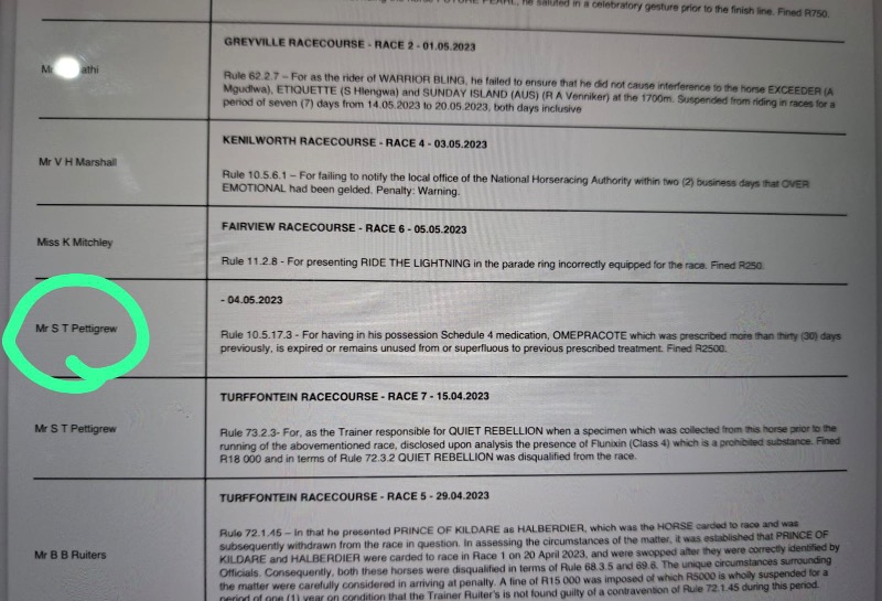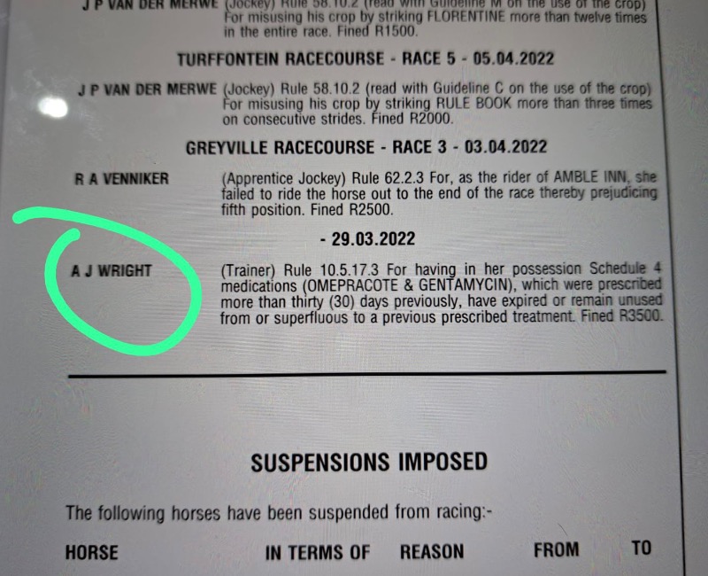 The National Horseracing Authority confirms that, following Out of Competition Specimen Collection performed by its Officials at Randjesfontein Training Centre and Turffontein Racecourse on Monday, 24 July 2023, an investigation was conducted into the veterinary treatments of horses declared as upcoming runners.