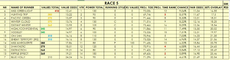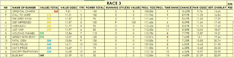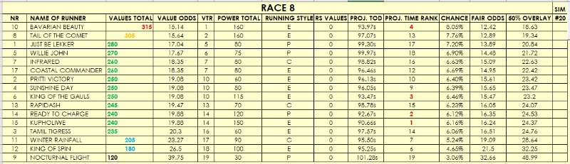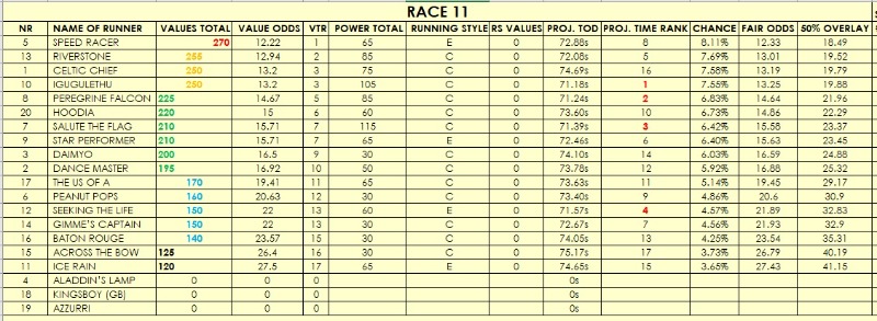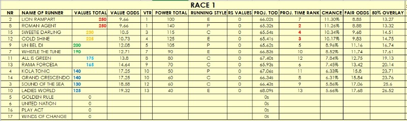 I am uploading my software ratings for all 11 races, 'out of the box'. Some races look clear from a ratings' perspective, others are as clear as mud with many aggregated on the same ratings. That said, there seems to be some value on offer in some races and I will be doing EWs on those and SWGs and EXAs with the top rated.