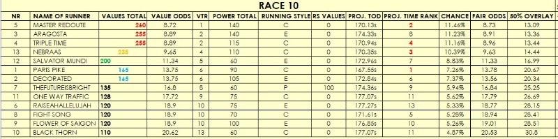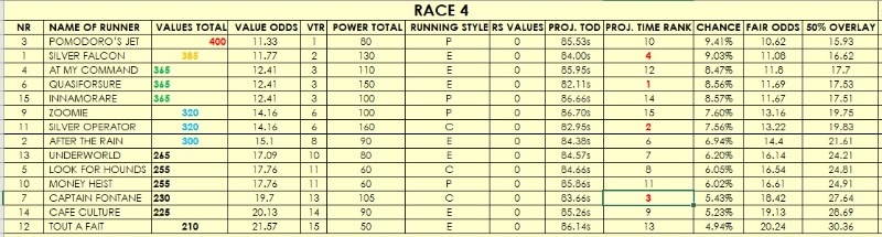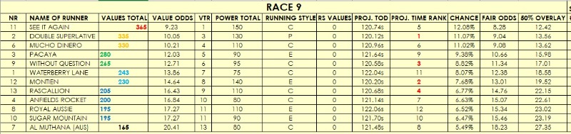 The main ratings to keep an eye on are VALUES TOTAL and VALUE ODDS (the latter is the software's odds line). POWER TOTAL values are based on 'conventional' racing wisdom and may reflect who the public will favor. Keep an eye on the PROJECTED TIME RANK (esp. over shorter) - I have found often those throw up some value.