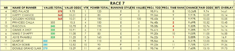 R7: Majorca - where I believe the Princess will have her revenge - her last effort I think was below par as the likes of Happy Chance and Saartjie would have a chance here if one takes that form at face value; Red Palace is said to be very capable and should use her stride here, but I think Princess Calla will run her down, with Beach Bomb in 3rd; Make It Snappy finding support in the market, but I think she would be hard pressed to match these after a break of almost a year.