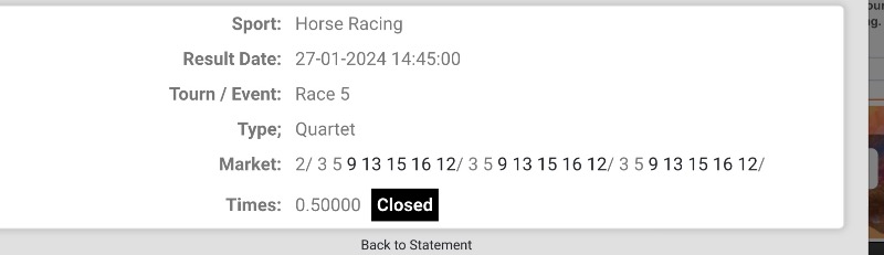 I know this is real ARM stuff..but got greedy and needed a rover. Didn’t like the fav.Result Date: 27-01-2024 14:28:43Tourn / Event: Race 5Type; QuartetMarket: 2/ 3 5 9 13 15 16 12/ 3 5 9 13 15 16 12/ 3 5 9 13 15 16 12/Times: 0.50000 Closed