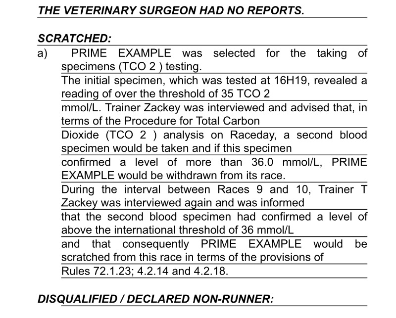 - If the TCO2 concentration of the second blood SPECIMEN is more than 36.0 mmol/L, the STEWARDS shall withdraw (scratch) the HORSE from the RACE and detain the HORSE for additional SPECIMEN collection.