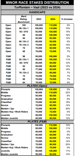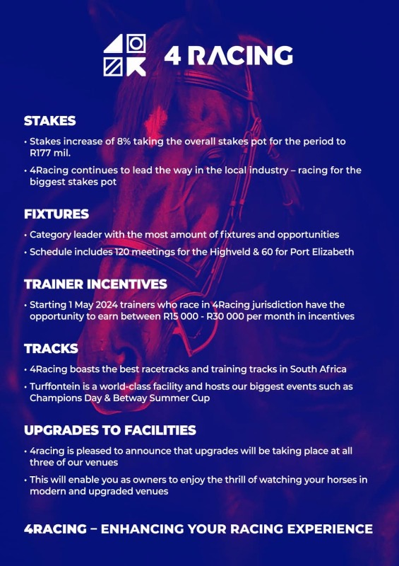 Johannesburg, 25 April 2024 – Following on the announcement last week regarding an increase in overall stakes to R177 million, 4Racing would like to provide all stakeholders with more details for the upcoming season. 4Racing are proud to maintain their position as leaders in this regard, offering the largest stakes pot in the country, attracting top talent and ensuring thrilling racing for all.