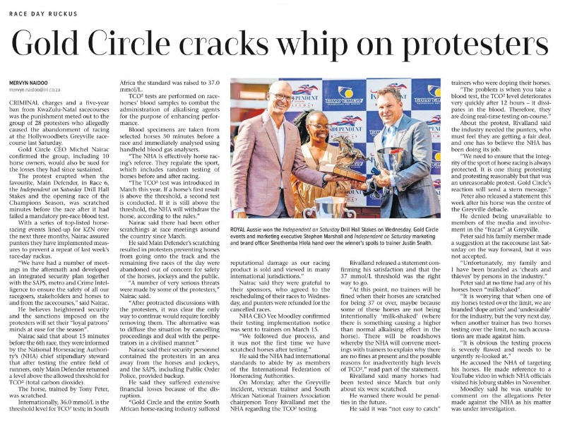 1 year 11 months ago - 1 year 11 months agoFollowing the abandonment of Saturday’s race meeting after the running of the fifth race, Gold Circle is pleased to announce that the R500 000 Independent on Saturday Drill Hall Stakes, the R500 000 World Sports Betting Guineas as well as the R500 000 WSB Fillies Guineas will be run at Hollywoodbets Greyville on Wednesday afternoon. This decision was reached following consultation with the Trainers involved and carries the support of our valued Sponsors.