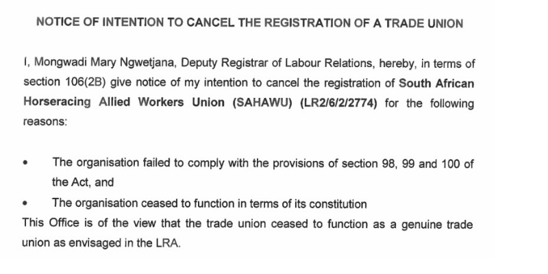 SOUTH AFRICAN HORSERACING ALLIED WORKERS UNION-DEREGISTERED