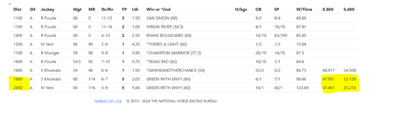 As is evident above, MID WINTER WIND produced a 800m to finish time of 47.951 in the KZN Guineas(1600m) and 47.861 in the Daily News 2000 (2000m) and a 400m to finish time of 23.159 in the KZN Guineas (1600m) and 23.274 in the Daily News 2000 (2000m). Given the factual evidence at hand, the Handicappers feel that MID WINTER WIND comfortably stayed the distance as a matter of fact.