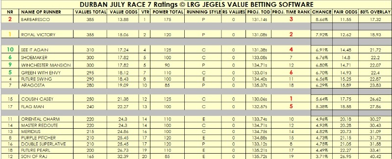 That said, here is my software's analysis of the main race. As usual, the software was on crack and threw Barbaresco on top by a margin followed by Royal Victory. From See it Again to Aragosta the ratings are close, and it becomes about luck in the running. It does not rate Flagman highly which I, prior to the analysis gave an outstanding chance having been touched off in the Daily News and now 1kg better for a 0.10 length beating by Green with Envy but that 17 draw! It did win a middle division at Greyville drawn 15/16 so, let's see. Take the ratings with a pinch of salt, no promises are being made, you bet based on these at your own risk.