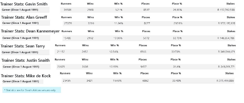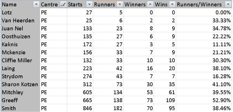 KZN at present have 30 active trainers. Badenhorst and T.Pretorius Have not raced for a long time. Excluded satellite yards and Pandaram yard.