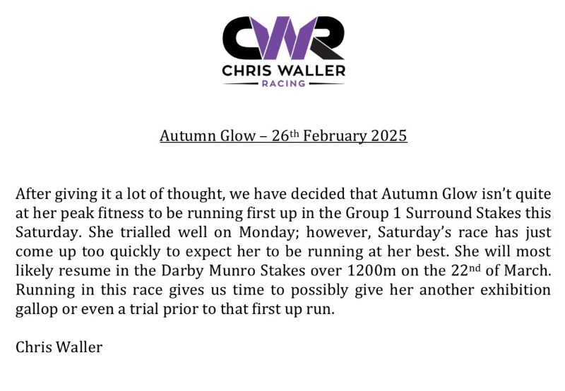 The unbeaten Autumn Glow was set to be one of the star fillies of the spring after bursting onto the scene winning at Rosehill in August.
