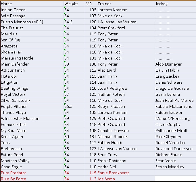 ‘Out of town’ raiders See It Again (M Roberts), the current favourite, drew 6 while last year’s defending champion Royal Victory (N Kotzen) pulled 15. Cape Eagle (A Nel) will be running from barrier 17 and Madison Valley (F Robinson) jumps from gate number 19.