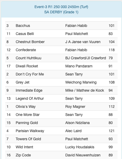 ENTRIES SA DERBY - SATURDAY MARCH 29