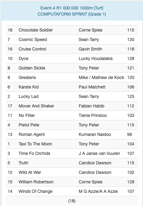 ENTRIES COMPUTAFORM SPRINT - SATURDAY 29 MARCH