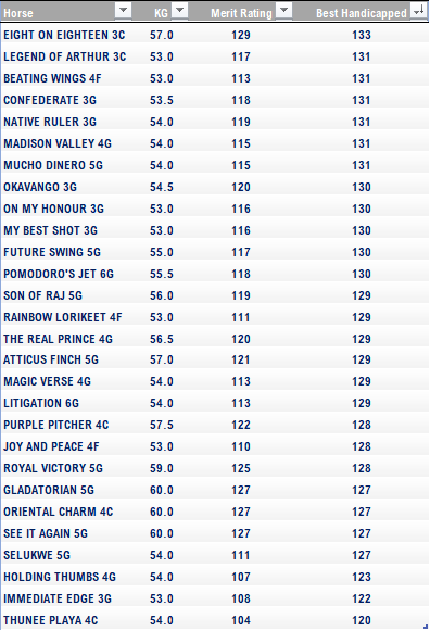 Whether you add 1.0kg to all the horses, or the wfa is already deducted, 8 on 18 should be the best weighted horse in the race. Compare 8 on 18 to any horse in the field, and according to Charl's ratings and weights, he is the best in. They'll be silly not to run him