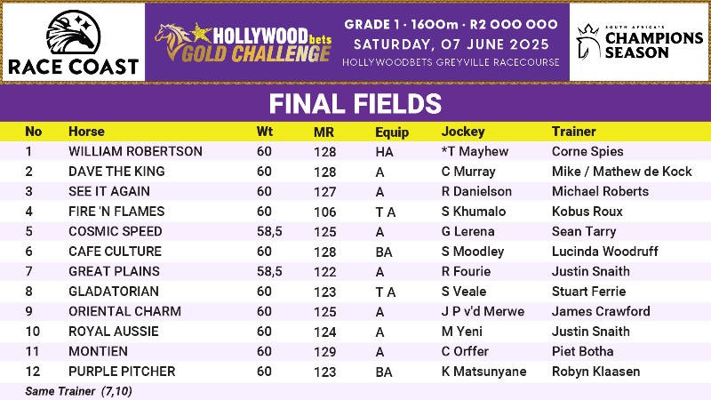 10 months 2 weeks ago - 10 months 2 weeks agoDurban – The R2-million Hollywoodbets Gold Challenge (Gr1) over 1600m at Greyville on Saturday has attracted a star-studded field including last season’s Horse Of The Year and defending champion, Dave The King. The 5yo son of Global View bounced back to his best form at Hollywoodbets Scottsville three weeks ago and from a neat draw will have every chance of recording back-to-back victories in South Africa’s highest-rated Grade 1 event. Callan Murray retains the ride for the De Kock team and Dave The King is likely to start favourite in the 12-strong field.