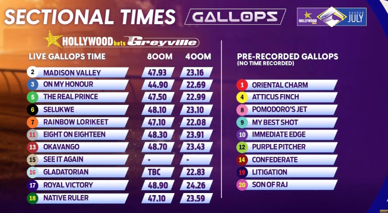 ......not that the times really matter as the pacier sorts showed they are quicker....but for me the best were 8on18 although he did not hit his top straps he is an imposing race horse.....and surprisingly Native Ruler but I may be biased as I am a sucker for the flashy chestnuts....
