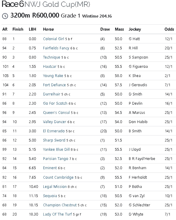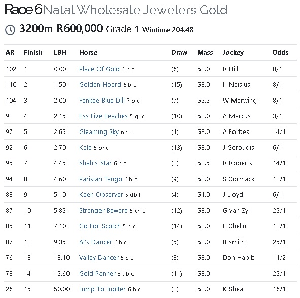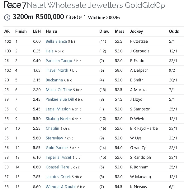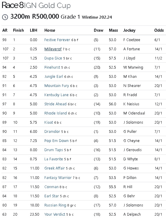 8 months 3 weeks ago1999 Natal Wholesale Jewelers Gold Cup 600k prize Run on a Saturday run end of august still a grade 1 race