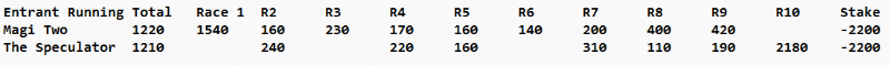Last edit: 8 months 3 weeks ago by Magi. Reason: Checked tote dividends to make sure I had allocated The Speculator the correct amount