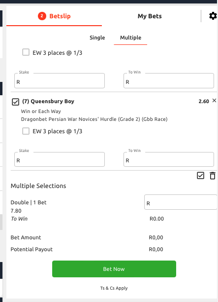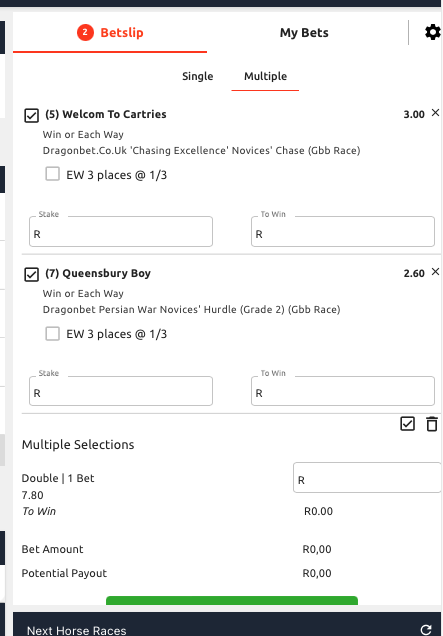 The placing of bets/multiples is the same, choose a race, then select your horse, go to the next race or meeting and do the same.