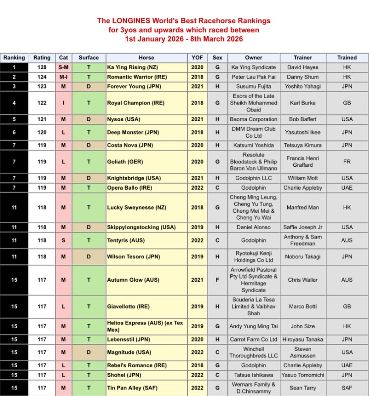 1 month 2 days agoStill you have to wonder - Ka Ying Rising 'only' 128 .... and Tin Pan Alley 117 ....Misleading as it's only the horses that have run from 1 Jan...so all the top European and British horses not even out yet ..Â