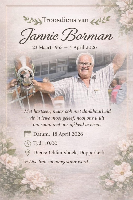 Johannesburg, South Africa β It is with sadness that 4Racing reports the passing of Vaal-based trainer, Jannie Borman on Saturday, 4 April 2026.