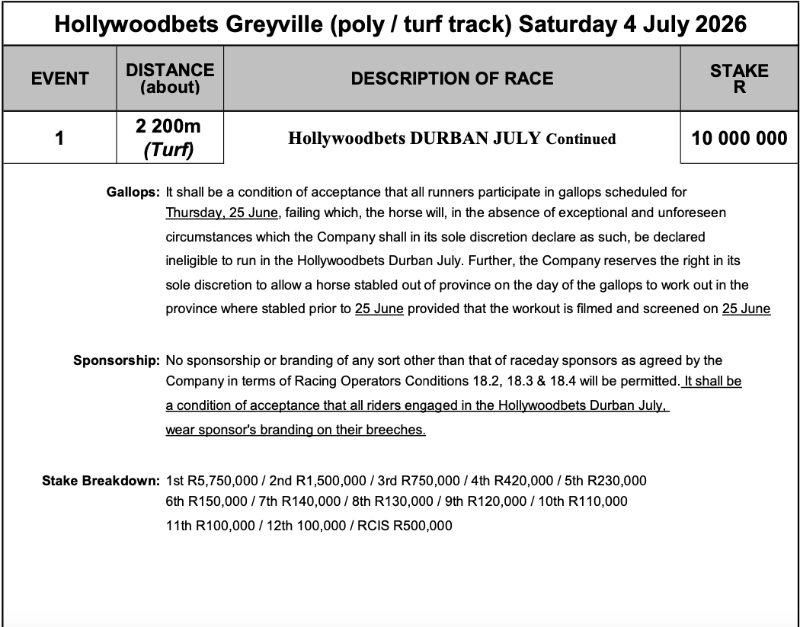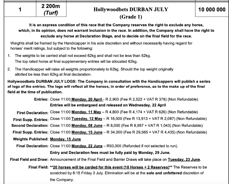 HOLLYWOODBETS DURBAN JULY FIRST ENTRIES