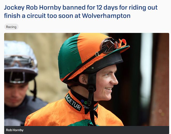 Jockey Rob Hornby was suspended for 12 days after he rode out a finish a circuit too soon at Wolverhampton on Wednesday