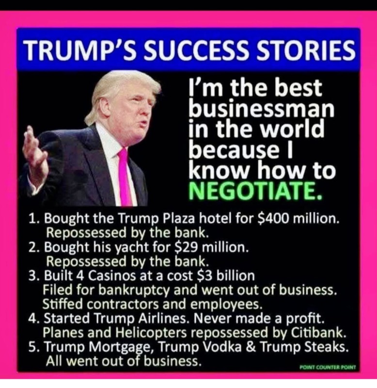 Sorry, you missed a point, the greatest negotiator has been BANKRUPTED 6 times - wish i had a father who would kick start my life with a million.