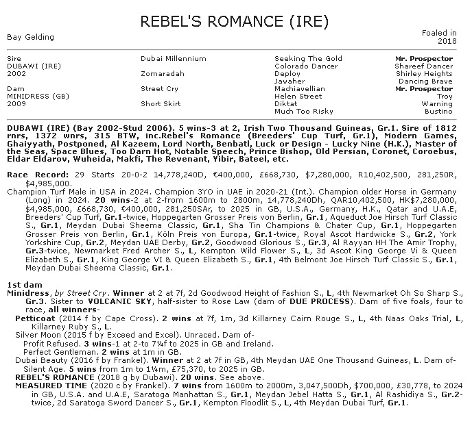 Rebel's Romance was cut to 4-1 (from 6) to become the first three-time winner of the Breeders' Cup Turf at Del Mar in November. He has also won the Yorkshire Cup and Hardwicke Stakes this season.